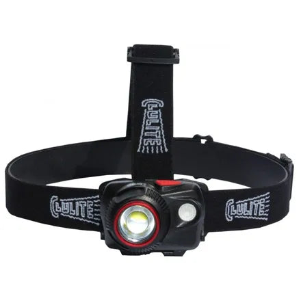 The Clulite Focus2Go Head Torch is a brilliant rechargeable LED headlight with a focus adjustable beam that allows you to select the beam type you want. With a XP-L Cree white LED offering 3 modes going from wide beam to narrow spot and vertical adjustment through 90° the Clulite Focus2Go Head Torch offers great flexibility and various range of uses. The Clulite Focus2Go Head Torch also has an additional 0.5W red Nichia LED that has both a flashing and a continuous setting. The Clulite Focus2Go Head Torch comes with a multi battery option; a 3.7v 800mAh Li-polymer rechargeable included in the pack or AAA batteries for back-up power or extended duration. The torch also comes with an adjustable head strap and a USB charging lead. The Clulite Focus2Go Head Torch is a slim and compact torch weighing just 95g and measuring just 62 X 41 X 43MM. The Clulite Focus2Go Head Torch is IP64 dust and water resistant making it the perfect companion for farmers, mechanics and other outdoor activities.