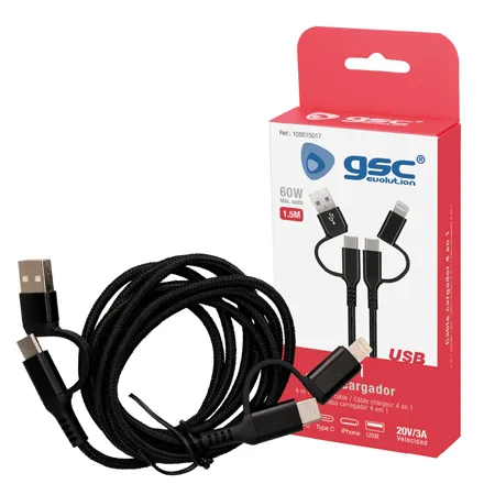 The GSC Evolution 4-in-1 Charger Cable is a versatile, reliable charging solution designed to keep all your essential devices powered up. With multiple connection options, this cable is ideal for home, office, travel, or everyday use. Featuring a USB input and durable Type-C connection, it supports up to 20V, ensuring fast and efficient charging for compatible devices.