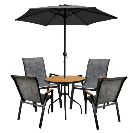 The breathable textilene chairs are designed for comfort, with 2x1 heather grey fabric and stylish wood-look armrests. The table measures D80×70cm and each chair measures 54×72×90cm, offering a spacious yet compact arrangement that fits well in smaller outdoor areas without compromising on comfort.