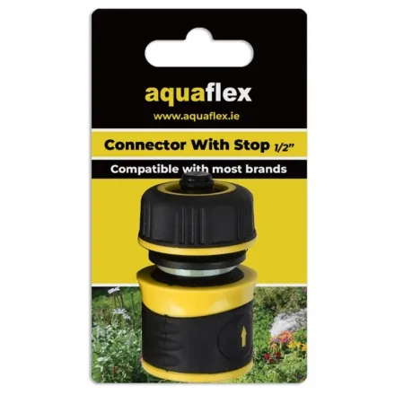 Compatible with all major brands of 1/2" garden hoses, the Aquaflex 1/2'' Connector With Stop combines versatility, durability, and practicality, making it an essential accessory for any gardener looking to improve efficiency and control in their irrigation setup.
