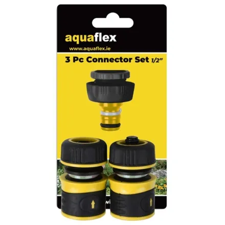 The Aquaflex 3 Pc Connector Set 1/2 In. includes a threaded tap connector, a snap-on hose end connector, and a water stop connector. Each piece is designed for use with standard 1/2" garden hoses, allowing you to repair, join, or extend your hoses quickly and easily.