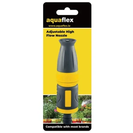 The Aquaflex Adjustable High Flow Nozzle 1/2" is a versatile hose spray designed to provide precise control over water flow. Its adjustable high flow feature makes it perfect for a wide range of gardening and outdoor watering tasks.