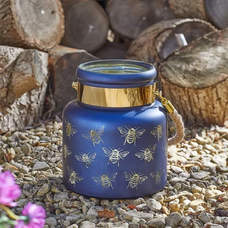 The Bee Lantern - Sapphire is a beautifully decorative glass lantern designed to add charm and warmth to any home or garden setting. Featuring an elegant bee design, this lantern creates stunning light patterns when illuminated, making it a standout decorative piece for both indoor and outdoor spaces.