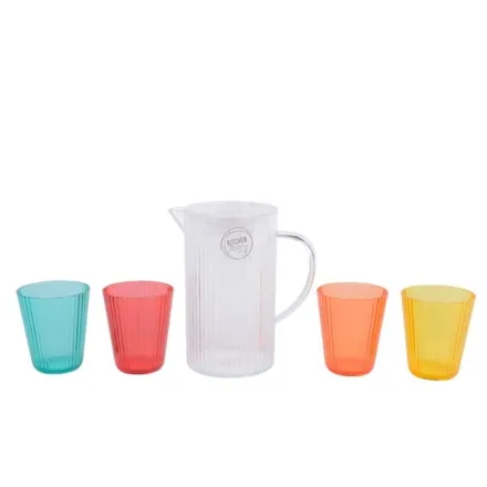 The Complete 5-Piece Set Stripe Pattern is a bright and practical addition to any kitchen, picnic, or outdoor table setting. This vibrant set includes one transparent pitcher and four colourful cups in yellow, blue, pink, and orange, adding a cheerful touch to everyday dining.