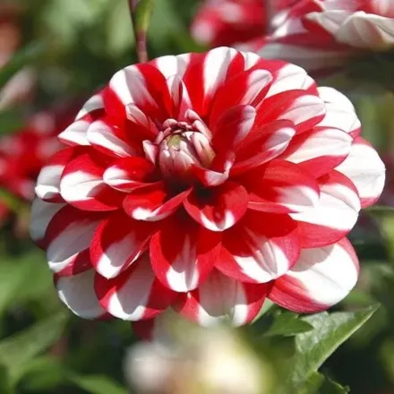 Dahlia Decorative ' Jamaica ' is a stunning easy to grow perennial within the Dahlia family, with beautiful ball type blooms of red petals accented by delicate white borders petals. Their stems are long with flowers held above their foliage which make them ideal for your cut flowers arrangements. While not heavily scented, the contrast between the red petals and white borders make a visually stunning display. Dahlia Decorative tubers can be planted 10cm deep in fertile well drained soil, in beds or containers for that touch of elegance.