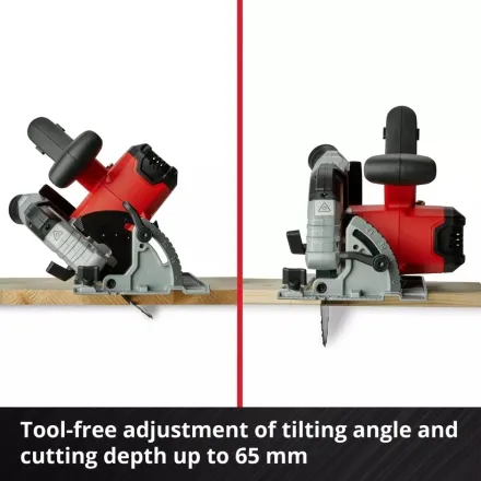 The Einhell 18V 190mm Professional Cordless Circular Saw (Body only) offers exceptional cutting performance with depths up to 65mm at 90° and 45mm at 45°. Easy tool-free adjustment of cutting depth and tilt angle ensures quick setup, while the large handle provides comfortable grip for tireless working. The high-quality LED illuminates the cutting area for optimal precision.