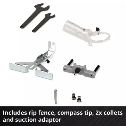 As a member of the Power X-Change family, the Einhell 18V Professional Cordless Router (Body only) is compatible with all Power X-Change batteries. Features include collets for 6mm and 8mm router cutters, spindle lock for easy tool changes, LED for optimal work area illumination, plastic insert to protect workpiece surfaces, ergonomic Softgrip handle, chip shield, two-hand attachment for precise operation, and includes rip fence, compass tip, tool, and suction adapter.