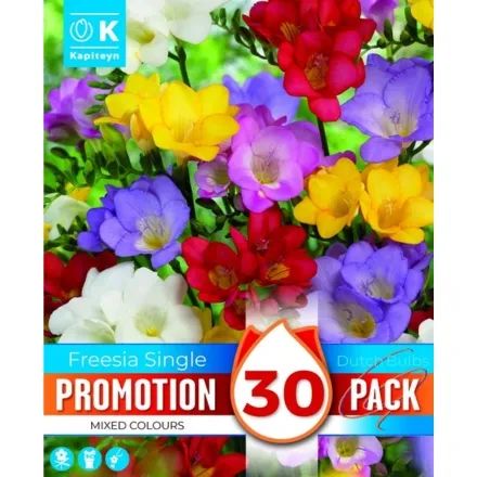 Fill your garden with colour and fragrance using the Freesia Single Mixed Colours X30 5/6. This generous pack of 30 single freesia flower bulbs produces elegant blooms in a beautiful mix of colours, well known for their sweet and distinctive scent.