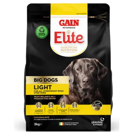 The GAIN Big Dogs Light is a complete meal for overweight dogs reaching more than 20 kg in weight. This feed contains L-Carnitine along with controlled quantities of high-quality protein and fat to assist maintain optimal baby weight, as well as a customized combination of Glucosamine, MSM, and Omega oils to help with joint care and mobility in larger dogs.