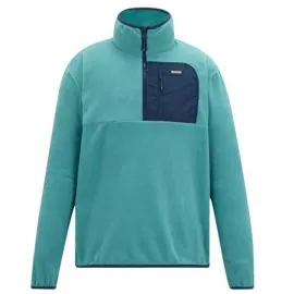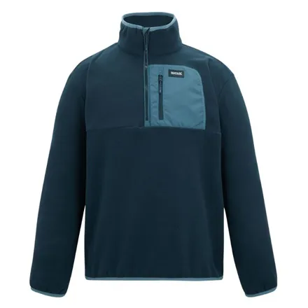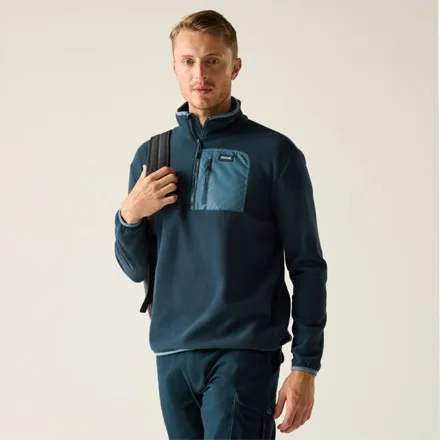 The Men's Frankie Half Zip Fleece Navy China Blue includes a convenient zipped chest pocket for secure storage, and stretch binding at the collar, cuffs, and hem for a snug, comfortable fit. Its half zip design offers ventilation when needed, while the use of recycled content in its fabric supports more sustainable clothing choices.