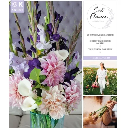 The Picking Happiness X10 is ideal for gardeners who want a dynamic mix of tall, elegant flowers. Zantedeschia 'Captain Ventura' produces white Calla lilies with speckled foliage up to 80cm tall. Gladiolus 'Cote d'Azur' features pale lilac blooms with darker edges, reaching 100cm, while Dahlia 'Lavender Perfection' and Dahlia 'Cafe au Lait' produce extra-large flowers in bluish-pink and creamy-white shades with a pink flush, respectively.