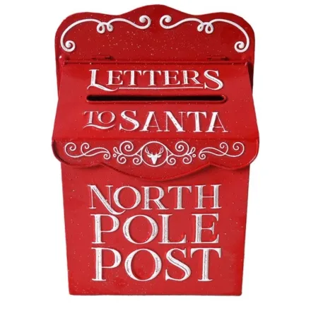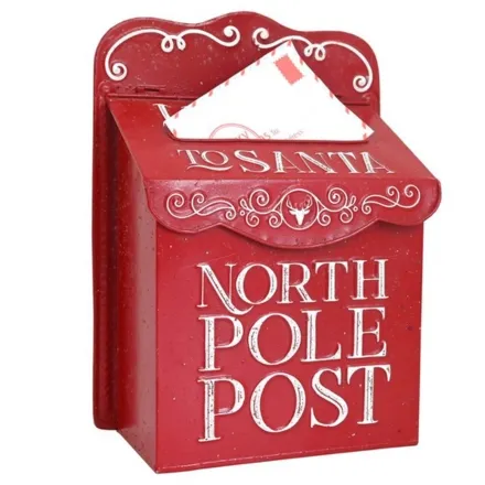 The Post Box North Pole 35cm features the words "Letters to Santa" and "North Pole Post," along with charming decorative scrolls and a reindeer motif that captures the nostalgic spirit of Christmas. At 35cm tall, it's perfectly sized for placing by the fireplace, under the tree, or in a hallway to create an enchanting festive focal point.