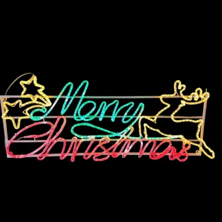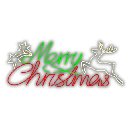 The Rope Light Silhouette Merry Christmas 1.8m is a rope light Merry Christmas silhouette measuring 180cm x 70cm, designed to create a focal point in your store or home. This illuminated Christmas decoration features rope lighting that spells out "Merry Christmas," making it perfect for shop windows, reception areas, gardens, and festive displays. The Rope Light Silhouette Merry Christmas 1.8m adds eye-catching festive cheer and creates an inviting atmosphere for customers and visitors during the holiday season.