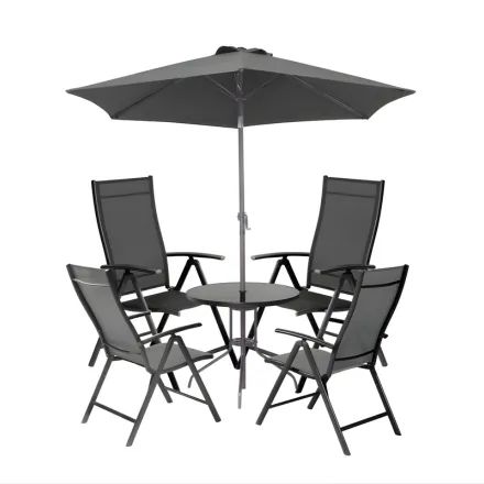 The Serra Dining Set - 4 Reclining Chairs Table & Parasol also features a compact round glass table ideal for smaller spaces and a 2.4m adjustable parasol with crank and tilt function to provide shade and comfort during sunny days, making it perfect for outdoor gatherings.