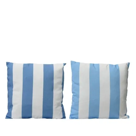 Crafted from durable, weather-resistant materials, the Square Outdoor Cushion Blue Stripe Design - Asst is built for outdoor use with easy-care fabric that stands up to everyday wear while maintaining its stylish appearance.