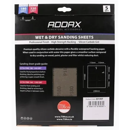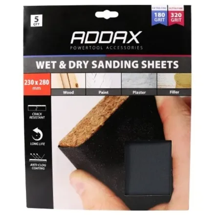 Engineered with advanced features for optimal performance, the Wet & Dry Sanding Sheets Black includes an anti-clog coating that extends sheet life and maintains consistent cutting action throughout use. The non-crack flexible paper construction ensures durability during demanding applications and conforms to contoured surfaces for smooth, even results. Measuring 230 x 280mm with assorted grits (180/320), these versatile sheets are perfect for fine finishing work, automotive refinishing, and achieving professional-quality surfaces. Whether you're preparing metal for painting, achieving a mirror finish on woodwork, or refinishing automotive bodywork, the Wet & Dry Sanding Sheets Black provides the long-lasting performance and superior finish you need.