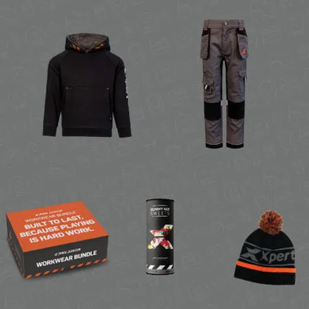 The Xpert Pro Junior Gift Bundle GGX is a winter-themed gift set aimed at kids, offering a practical yet fun assortment of clothing and accessories. This bundle typically includes a sleek black hoodie, grey/black work trousers, a beanie hat and gummy sweets.